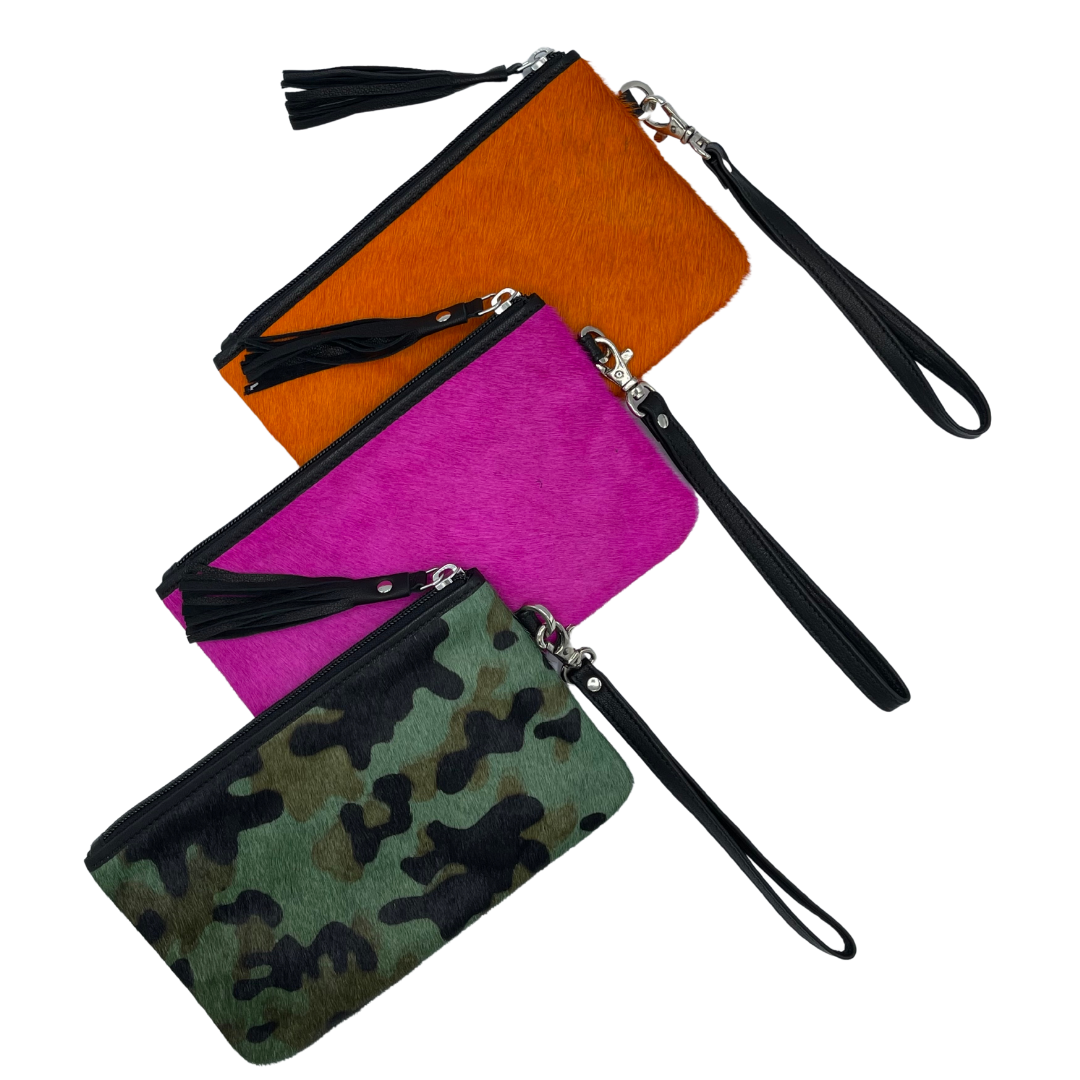 These funky, furry, hair-on hide medium-sized clutches are perfect day or night. Available in Pink, Orange, Camo, Black, (very dark) Navy, Cow & Zebra print.