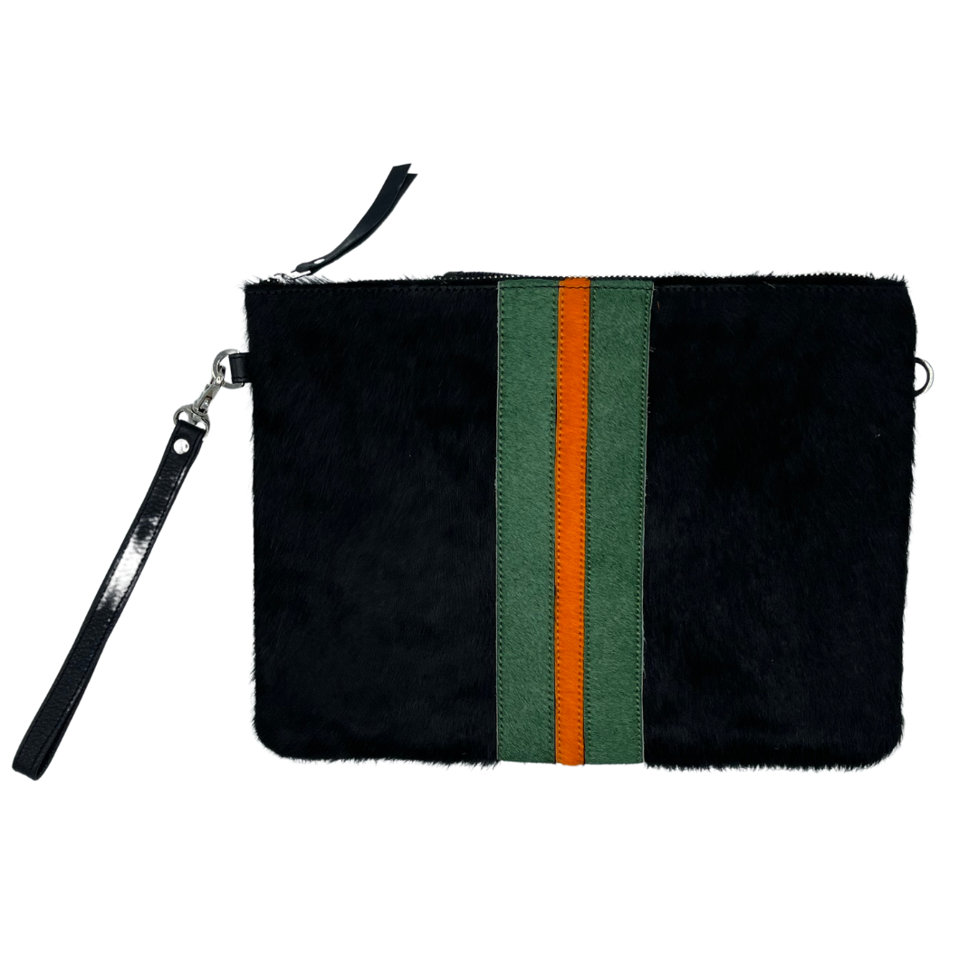 This Black Crossbody / Clutch has vivid Green & Orange Stripes.