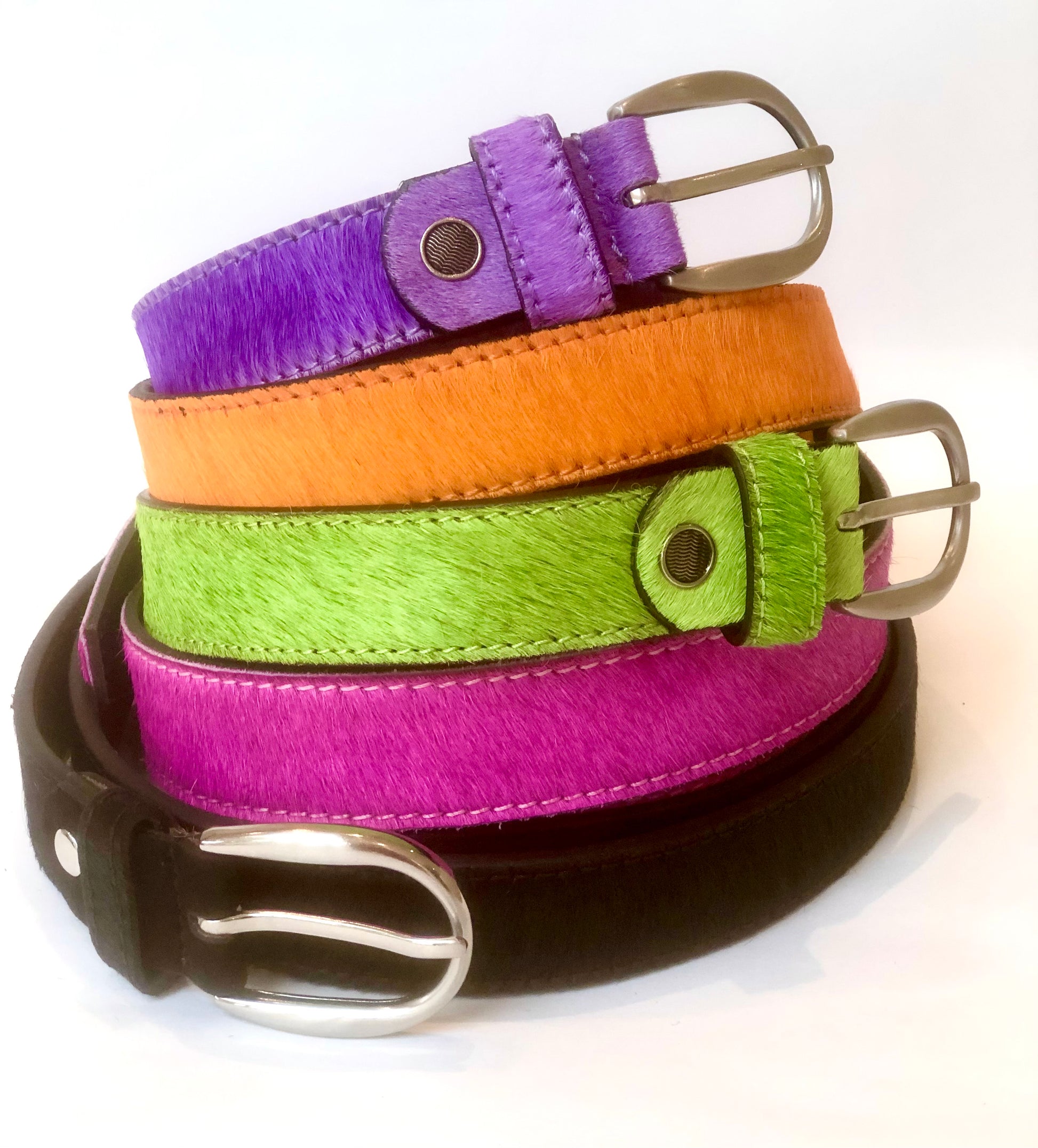 These stunning handmade hair on hide belts come in neon pink, lime green, orange, and purple. They are uber stylish, with a chrome coloured buckle and are the perfect way to complete an outfit.