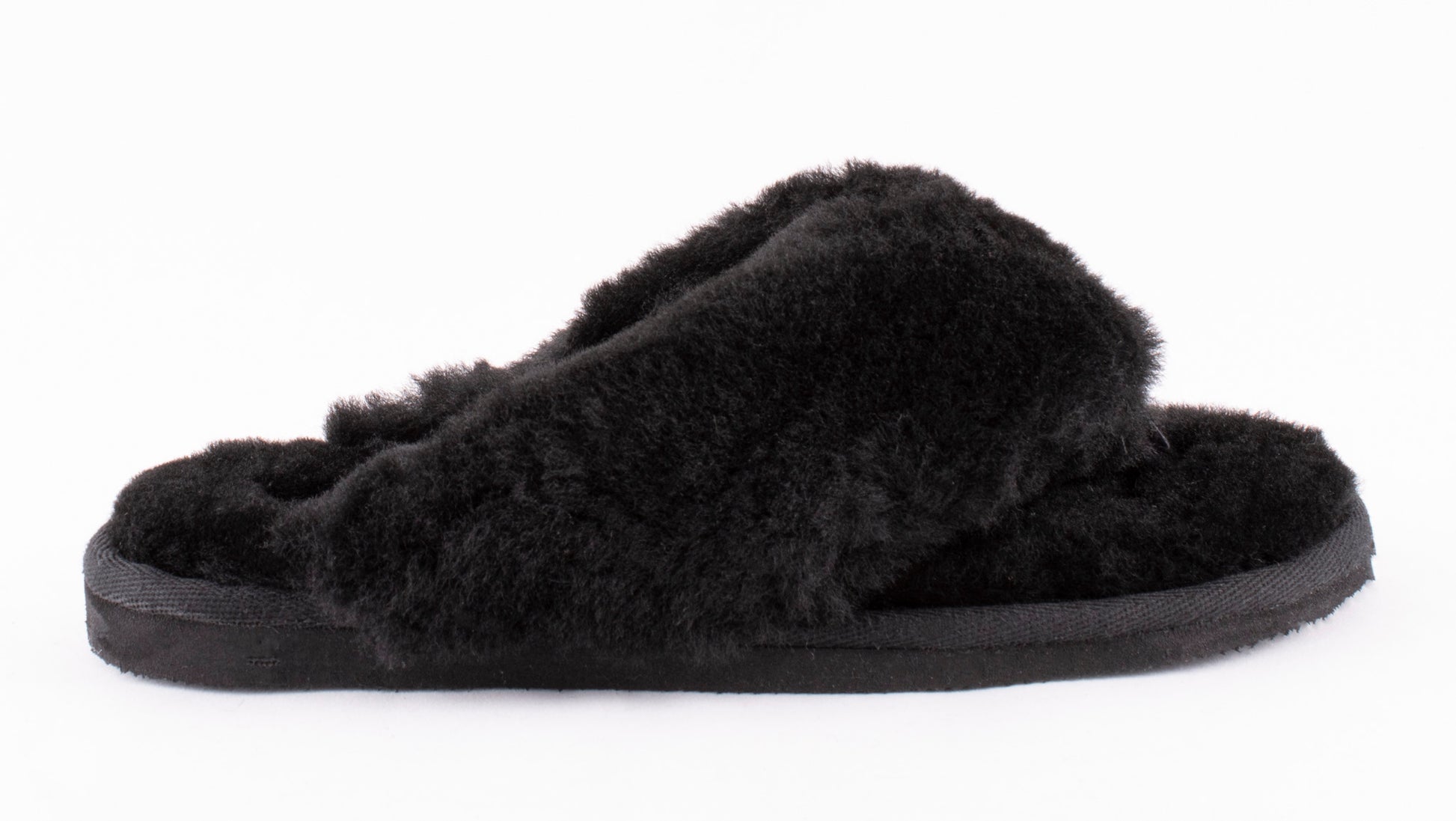 These funky thong-style black sheepskin slippers from Shepherd of Sweden are uber stylish and comfy – a sheepskin flip flop that’s bound to make you smile. Rubber base, 100% sheepskin upper.